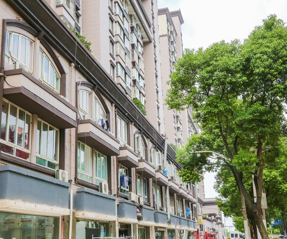 该修缮项目共包含小区内6幢16-18层高的住宅楼以及沿街店面,主要工程涉及屋面、外立面、公共部位墙面、小区附属设施、垃圾房、停车位等,并同步对空调外机等外立面附加设施开展整治。