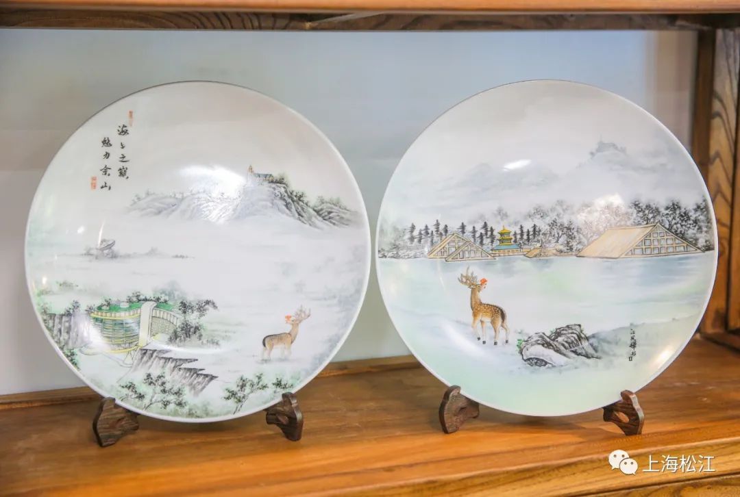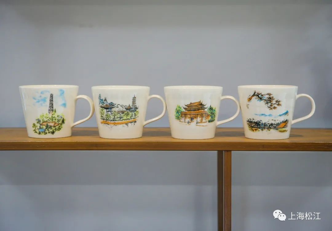 在悉觉陶瓷文化传播中心,记者看到了不少包含松江元素的“富林烧”产品,有佘山、天马望远镜、佘山世茂洲际酒店等元素的“海上之巅,魅力佘山”手绘瓷盘和广富林文化遗址手绘瓷盘,还有绘有泗泾古镇、天马斜塔、云间第一楼图案的杯子……