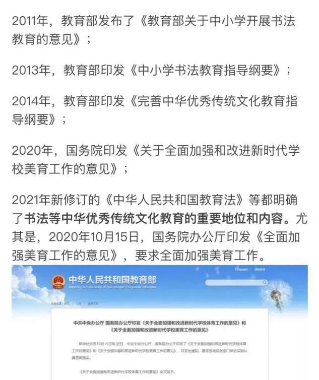 多年来,教育部高度重视以书法为重要载体的中华民族优秀传统文化的传承教育,先后印发《关于中小学开展书法教育的意见》和《中小学书法教育指导纲要》,明确了书法教育相关课程的开设要求,以多种措施加强中小学书法教育。看看近几年教育部颁发的关于书法学习的相关文件:
