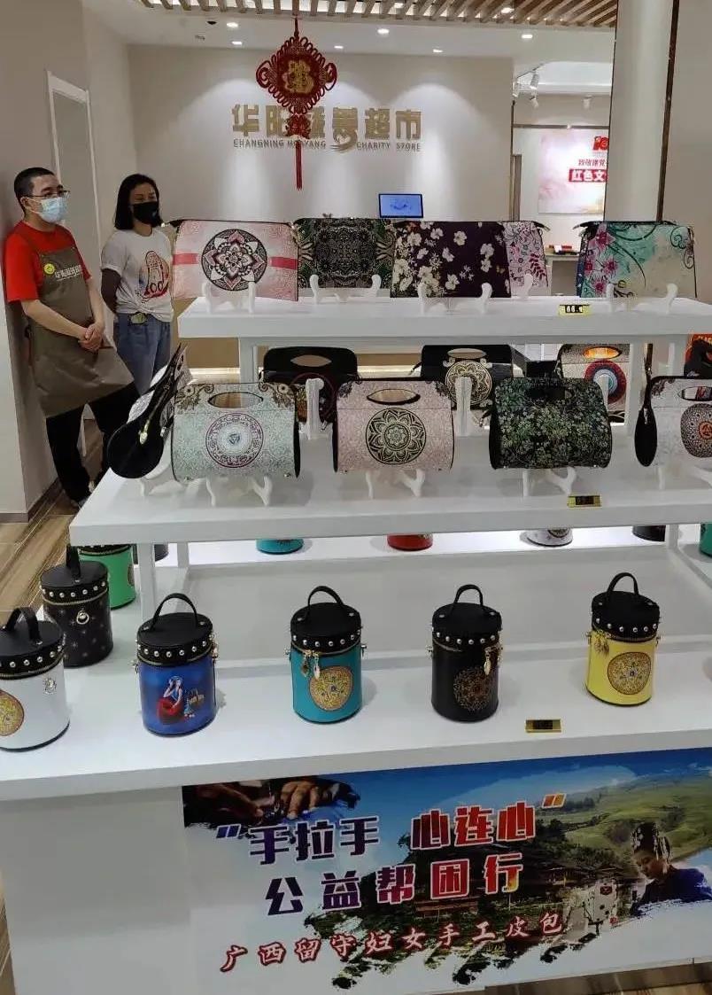 在今年完成升级重新开业的华阳路街道慈善超市,探索文创产品搭建孵化平台,其中就包括了江西景德镇地区的手工艺品和广西柳州地区的手工包制品。