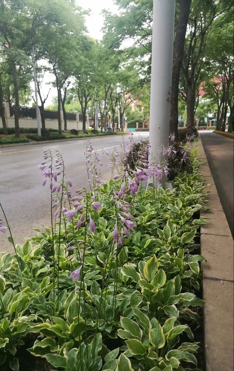 吉浦路(政立路-万安路)市级林荫道两侧行道树品种为苦楝,树穴内种植多花筋骨草(紫花),既自然和谐又兼顾耐荫易养护。
