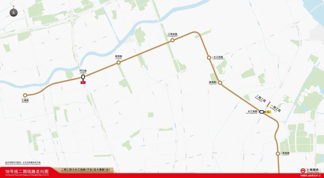 18号线途经浦东、杨浦、宝山三区,一期全线共设26站,分为南段(已开通)和北段。南段从浦东航头到御桥,共8站,长约15公里,目前已投运。而在建的北段从御桥到长江南路,共18站,长约22公里。计划年底开通试运营的18号线一期北段,起于御桥站,向北穿越浦东、杨浦、宝山三区,终于宝山区的长江南路站。