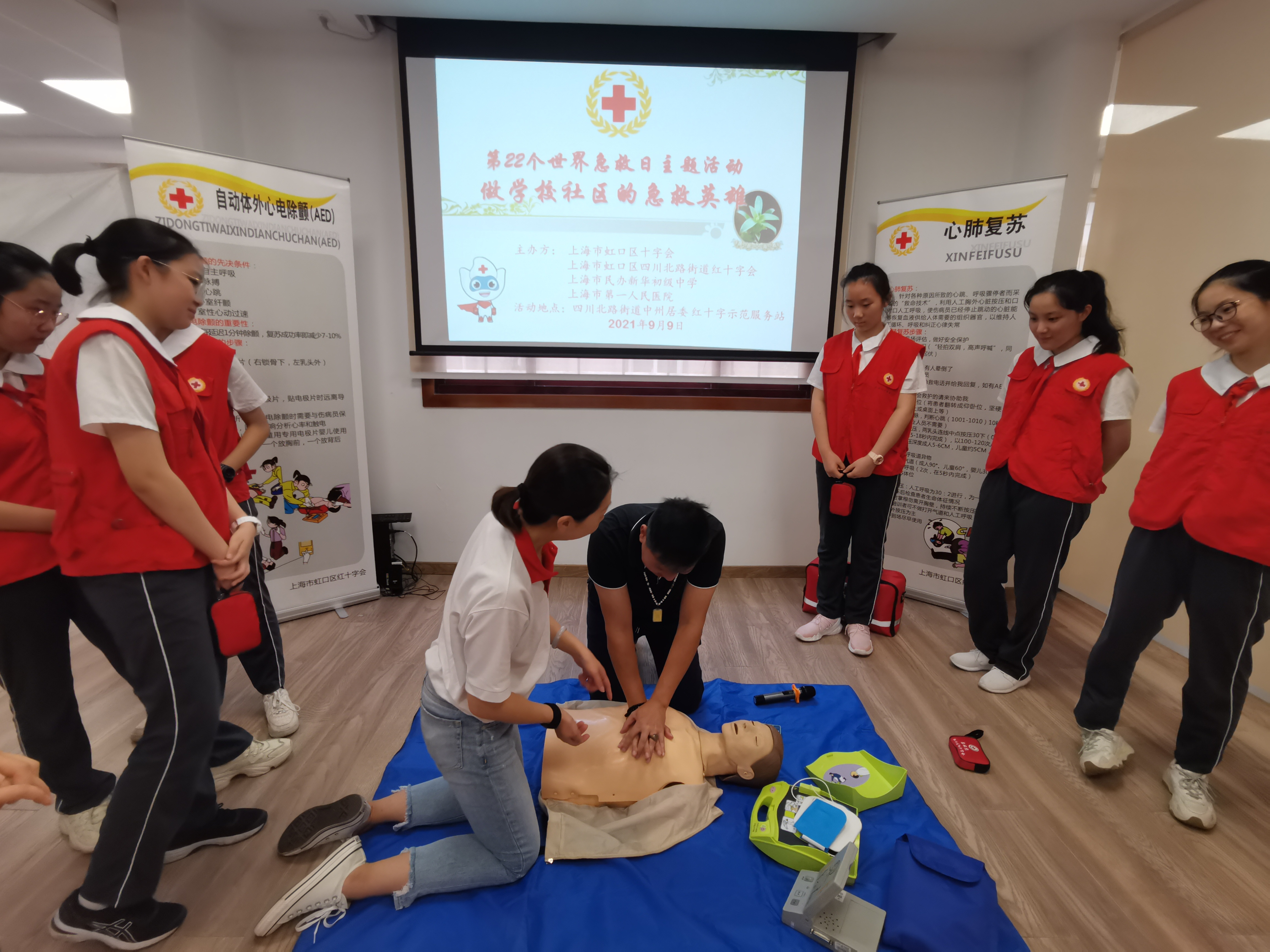 培训中,来自民办新华初级中学的20名学生代表及社区群众,在上海市第一人民医院急诊科总护士长、红十字应急救护师资杨炯老师带领下,通过理论知识、应急技能实际操作等环节,学习心肺复苏及AED使用技能。