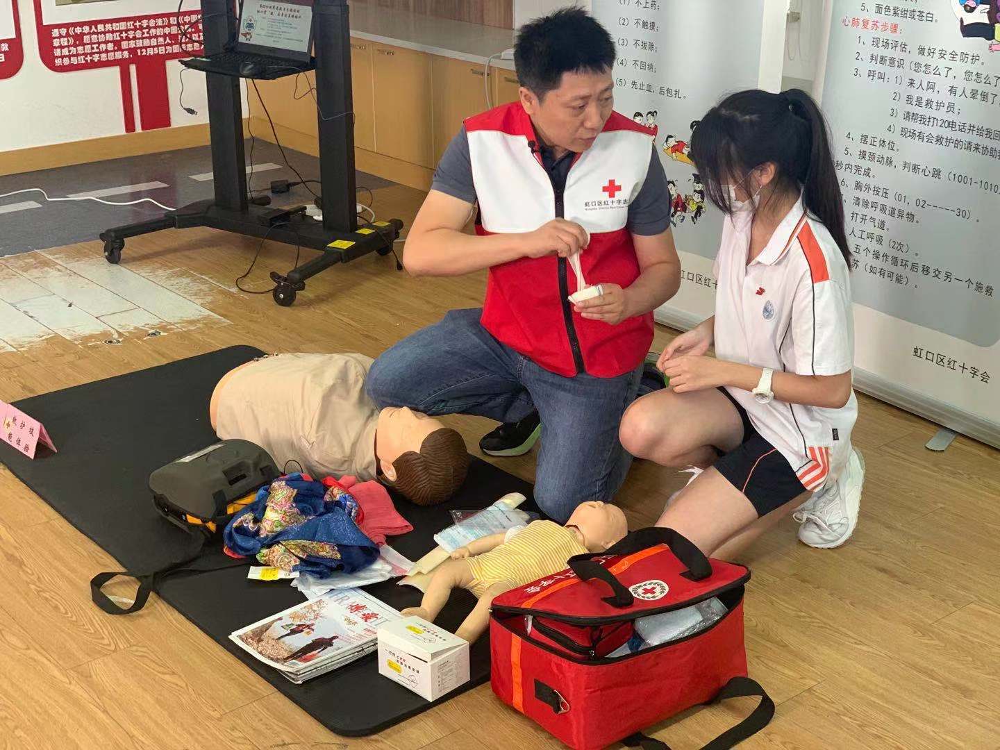 与此同时,在四川北路街道中州路居委红十字示范服务站内,一场以“生命健康安全教育”为主题的应急救护技能培训也正在开展。