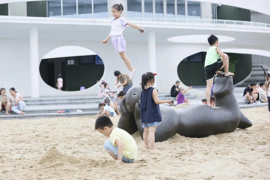 从主入口进入公园,就到达了草坪思贤区,它是由思贤小筑、儿童沙滩、开放草坪等功能场地组成。在这里,沙滩和可爱的胖娃是孩子们游玩的理想之地,层层台阶也给带娃的家长们提供了休憩的场所。