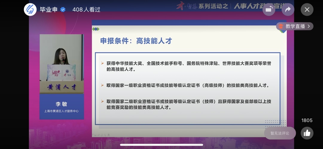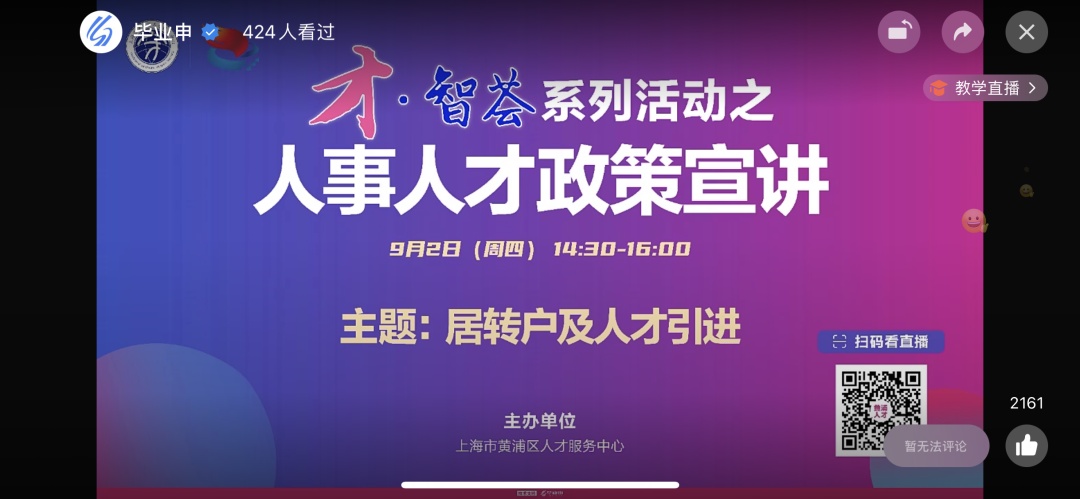 2021年9月2日下午,黄浦区人才服务中心举办“才·智荟”系列活动之人事人才政策宣讲活动,本场“才·智荟”活动利用时下热门的“直播”元素,采用“线上+线下”模式同步开展“居转户”及“人才引进”政策宣讲。