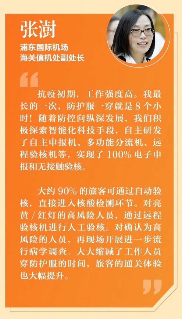 张澍难忘抗疫之初,关员工作强度极高,她最长一次,防护服足足穿了8小时。随着疫情防控向纵深发展,海关积极探索智能化科技手段,自主研发了自助申报机、多功能分流机、远程验核机等,实现100%电子申报和无接触验核,约90%的入境旅客可通过自动验核,直接进入后续的核酸检测环节。“这样的工作模式,使得穿防护服的时间大大缩减,旅客的通关体验也得到大幅提升,实现了安全与便利的统一。”
