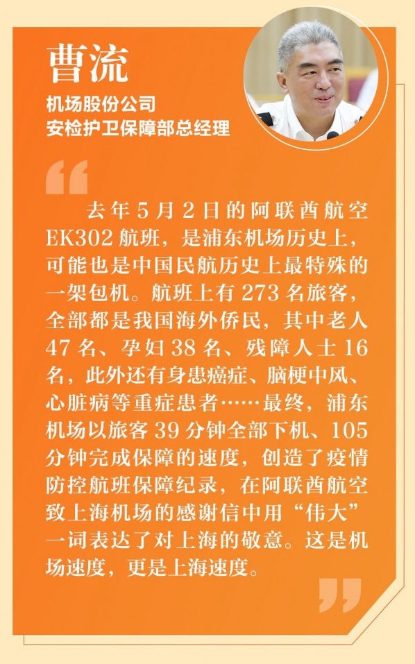 令曹流印象最深刻的,莫过于去年5月2日对阿联酋航空EK302撤侨航班的保障工作,“这恐怕是浦东机场历史上最特殊的一架包机,机上273名旅客,老人47名、孕妇38名、残障人士16名,还有身患癌症、脑梗中风、心脏病等重症患者”。最终,浦东机场以旅客39分钟全部下机、105分钟完成保障的速度,被航司惊呼“奇迹”。但硬仗一场接着一场。今年8月20日,浦东机场外航货机作业人员被确诊阳性。为及时阻断传播链,上海机场迅速动员组织集团下属各单位干部员工900余人,对驻场1082家单位、7万余名员工进行全面排摸,浦东机场区域10家第三方核酸检测机构,会同市卫健委组织的近600名医护人员,连夜筛查,仅用两天时间就完成了两轮全员核酸采样。