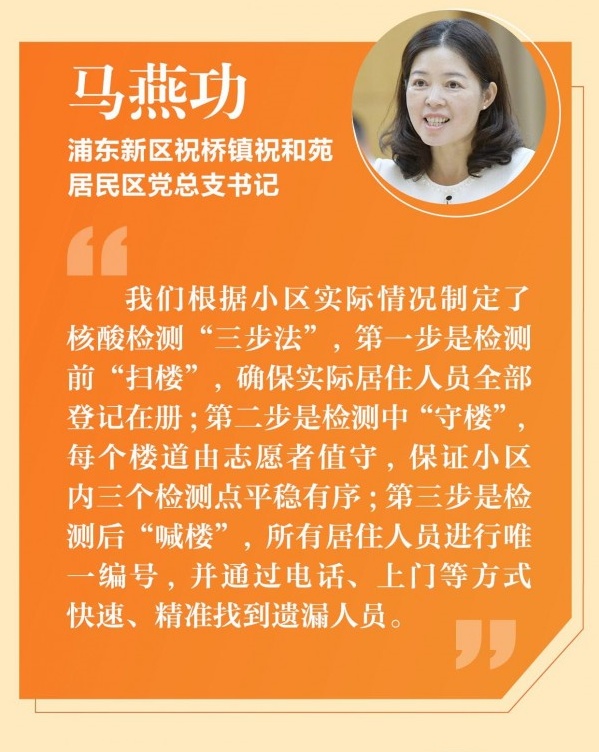 作为浦东新区祝桥镇祝和苑居民区党总支书记,马燕功和同事们不久前经历了一场特殊的考验:8月21日,因小区内一名在浦东机场货运部工作的居民被确定为新冠肺炎确诊病例,祝和苑北区被列为中风险地区,2864名居民进行了为期14天的封闭管理,于9月4日零时解封。“第一次核酸检测时,所有人都没有经验。我们小区有91个楼栋,大部分是五六层的楼房,志愿者们一栋栋地爬楼,一家家地敲门告知,最后连爬楼的力气都没有了,坐在楼道里站也站不起来。从18时30分开始做核酸检测,直到第二天凌晨2时30分才全部完成。”
