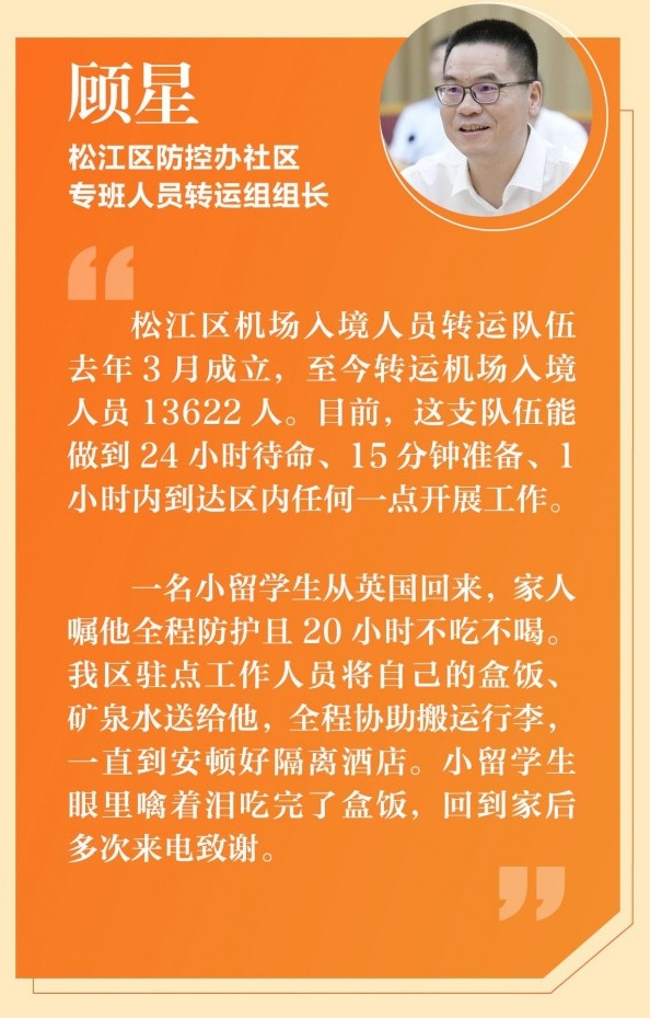 “我们的主要工作职责是负责松江区机场入境人员转运工作,在应急状态下区内重点筛查人员转运,并对包干街镇社区防控、隔离点工作进行指导。”顾星说,自组建松江区机场入境人员转运工作队伍以来,共组织20批由机关志愿者、公安、医疗、后勤等人员组成的工作队伍,转运机场入境人员13622人(含中国籍12543人、外国籍1079人),实现工作人员“零感染”、转运对象“零差错”,在“外防输入”上守好“国门”。