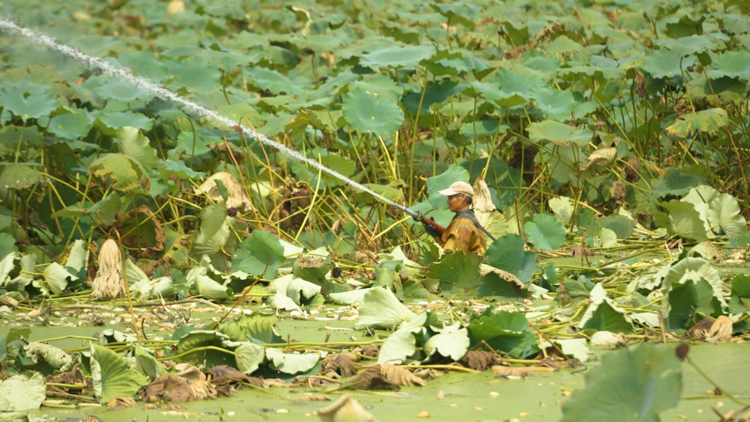 说到采藕,这真的是一件很累很辛苦的差事。挖藕人穿着防水裤踩进水里。他们仔细地扒开层层叠叠的莲叶,猫着腰,仔仔细细地寻找着“藕娃娃”睡着的位置。