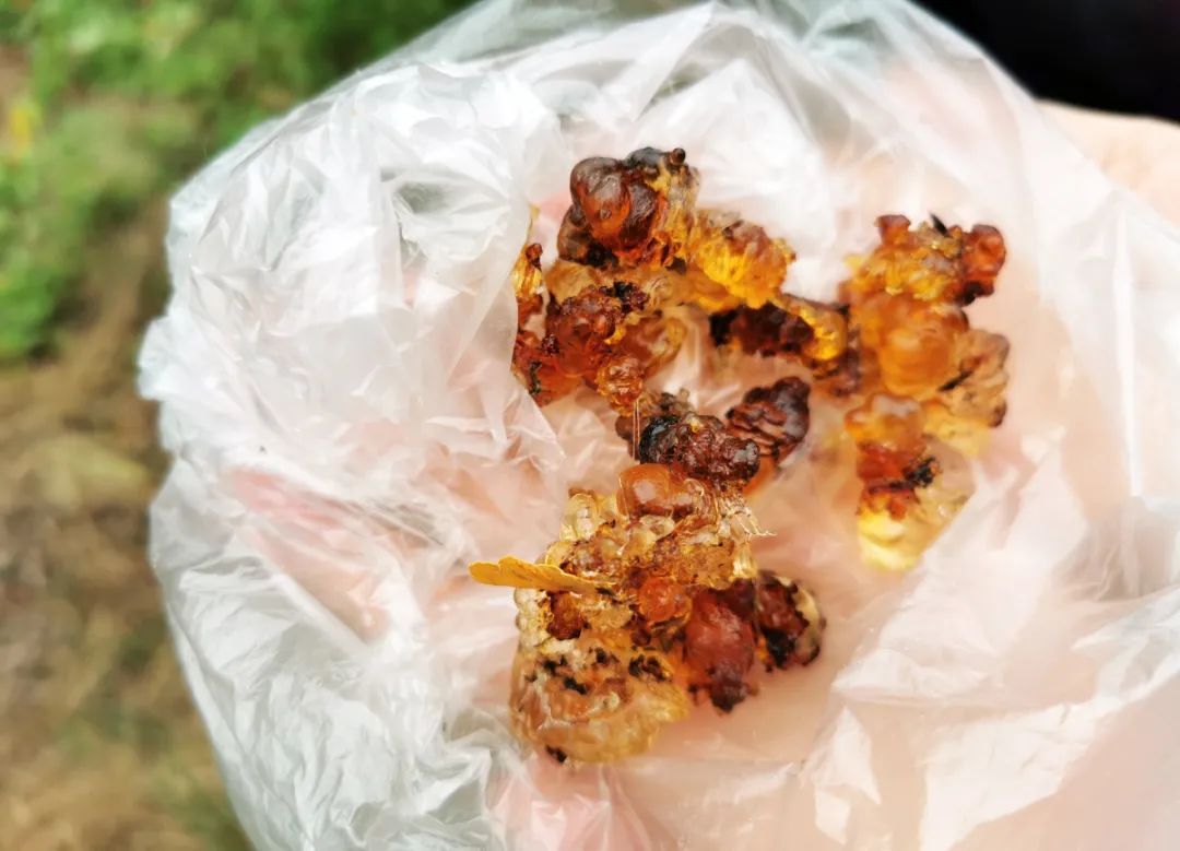 他还会现场告诉他们桃胶的食用方法:采好以后回去用烧开的水,趁水还温热的时候清洗,清洗好以后漂出来,把表面上腐烂的桃皮清理掉,放在透风阴凉的地方晾干,就能保证桃胶的色泽味俱佳了。