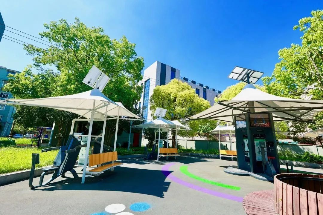 多数器材以伞亭的形式呈现,通过增设适老设施和残疾人友好器械、安全照明等,让健身空间充满温度。