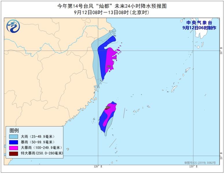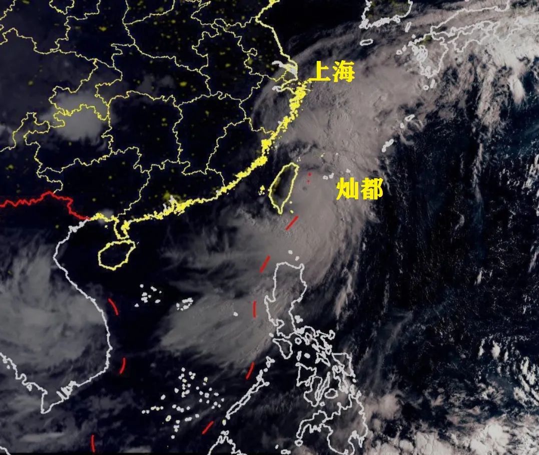 今年第14号台风“灿都”(超强台风级)的中心今天(12 日)09时位于我国台湾省宜兰县南偏东方向大约105公里的西北太平洋洋面上,就是北纬24.0度、东经122.4度,中心附近最大风力有16级(52 米/秒),中心最低气压为935百帕,七级风圈半径220~300公里,十级风圈半径130~150公里,十二级风圈半径70公里。