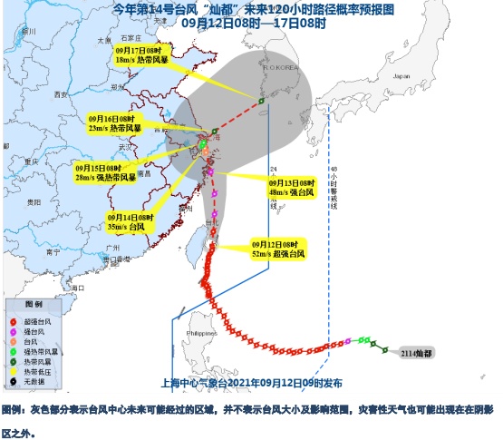 预计,“灿都”将以每小时20公里左右的速度向偏北方向移动,12日下午到傍晚擦过台湾岛东北部进入东海南部海域,13日中午到傍晚登陆舟山或穿过舟山群岛,可能于13日夜间登陆上海南部(35-40米/秒,13级,台风级),14~15日在杭州湾到上海附近回旋少动,16日开始转向东北方向移动,逐渐远离本区。