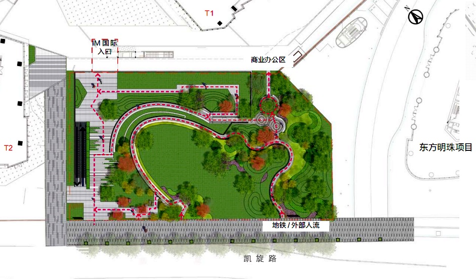 凯旋绿地项目位于新华社区J1街坊J1B-02地块。该地块位于IM Shanghai长宁国际发展广场的西南角,项目总用地面积约3000平方米,拟建设绿化景观面积2460平方米,铺装硬质场地面积约540平方米。