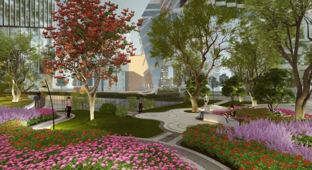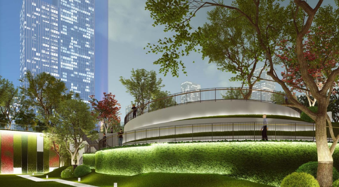凯旋绿地的设计主题是“环形艺术山谷”。从效果图中就能看到,项目在设计上,以“圆环”作为主题元素,连接上下不同的景观空间,创作出一个奇妙的双层绿化“口袋”,站在不同的高度可以看见不一样的风景,开启一场城中山谷的探秘之旅。绿地空间以完全的开放的形式呈现,将绿地分为地上游园空间与地下绿植空间,形成了一个“山谷”环形的人流交通,增加了平面和立面两种不同的绿植效果。