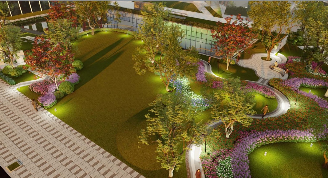 曲线蜿蜒且略带起伏的道路穿梭在绿荫下,结合弧形的活动广场,将有一种音符般的灵动感;下沉广场与商业体连通,四周被绿色环绕,极具现代感。