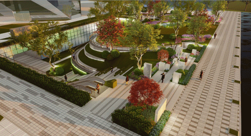 绿地的形态采取层叠布置,将下沉广场和地面结合在圆环绿地中,形成了“层叠圆环之意”。