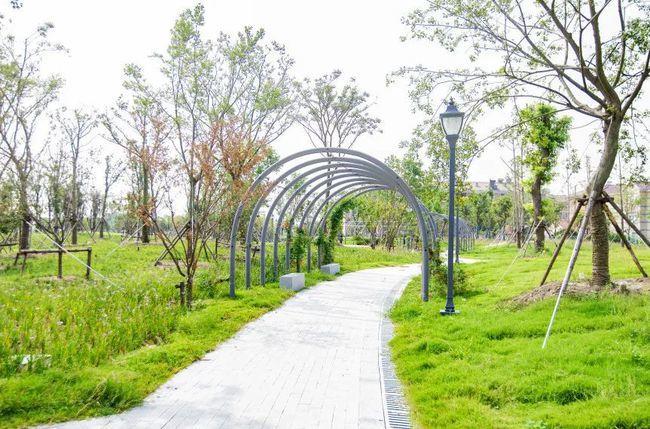 在冯桥村生态绿地,沿着错落的石阶步道迈进公园,映入眼帘的是透露着昂扬生机的各类苗木,虽然栽种时间不久,但公园美景已见雏形。绿地内穿插栽种了萱草、紫娇花、黄金菊等地被植物,与乌桕、银杏、朴树等高大的乔木形成了高低错落、颜色丰富的绿色景观。公园还打造了多座凌霄花拱门,待花藤爬满拱门,市民便可在下面纳凉休息,尽享绿意盎然。公园还别具匠心的将柘林本土非遗“板晒制盐”的工序融入景观小品建设,“推盐”“ 畚盐”“ 晒盐泥”等制盐工序,展现非遗文化的独特魅力。除文化景观小品,园内还设有一处由卵石构成的心形池子,为公园添姿加色。此外,在公园的东入口处,还将建设一处休闲健身区,配套专业健身器材,将满足居民在家门口的健身需求。