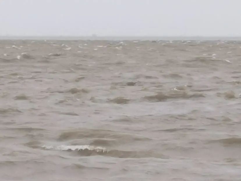 9月13日上午九点半,记者在宝杨路码头看到,树枝在狂风中凌乱摇摆,江面水位升高,江水如同开水般沸腾,一层层白色浪花不断翻涌,掀起波涛,在最高点碎裂,在岸边溅起飞花。此时,江面上的风力已达六、七级。