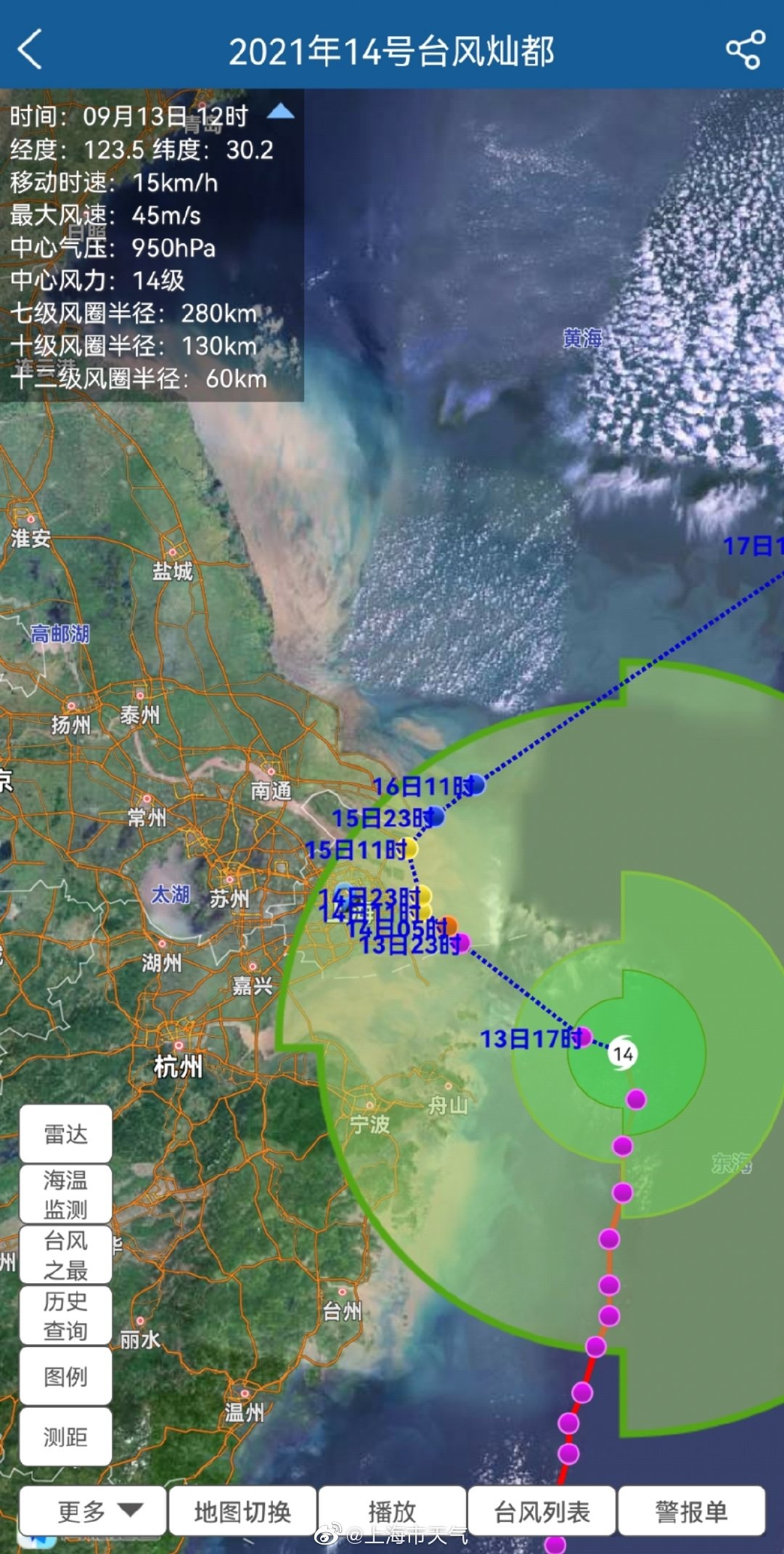 和上午的预测略有不同的是,它的移动路径又有了新的“变化”。根据上海中心气象台下午的最新预测,原本预定将直接登陆上海的“灿都”很可能将和上海“擦肩而过”,预计今天夜间到15日会在上海以东100~200公里处的海面上回旋,直到16日才会向东北方向移动,并逐步远离。