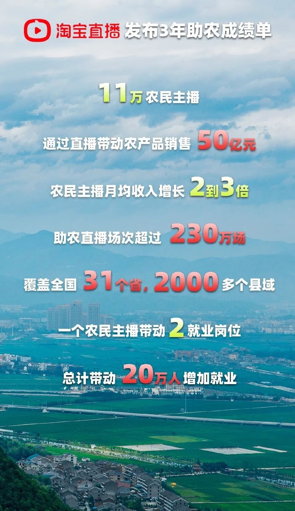 9月7日,淘宝直播发布了一份特殊的“成绩单”,在系统性的直播助农计划“村播计划”上线三年后,淘宝直播平台累计已有11万农民主播,开播超过230万场,通过直播带动农产品销售超50亿元。他们用一场场直播,将家乡的地产风物卖到了全国,提高了收入水平。