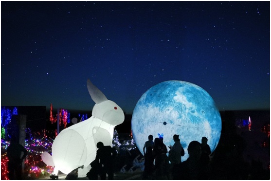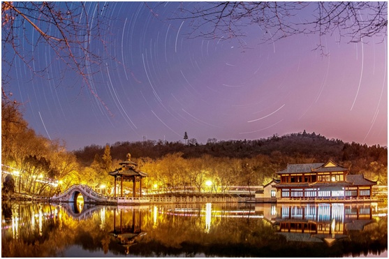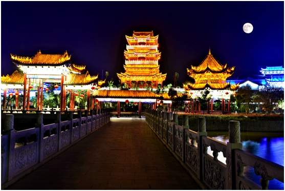 安庆五千年文博园位于安庆市太湖境内。景区内拥有数百个主题场景,各有特色。月夜,一轮金黄的圆月高高挂在半空,皎洁的月光笼罩着灯火通明的园区,如轻纱般温柔。站在文博园二期十里画廊,天空星星闪烁,月光仿佛显得格外柔美。