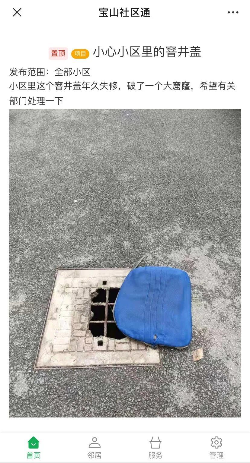 日前,月浦四村有居民在“社区通”平台反映小区窨井盖有严重破损问题。居委会工作人员获悉这一情况后,第一时间赶往现场进行查看,发现该处井盖大面积破损,给来往行人和车辆造成了不便,也存在一些安全隐患。