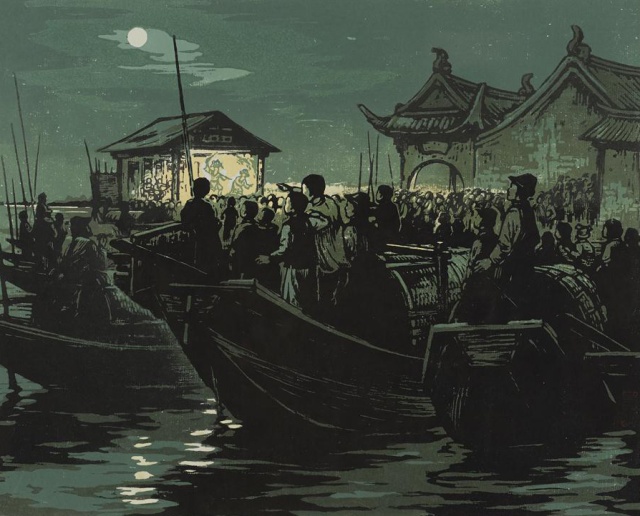 百姓摇船去看社戏的场景。
