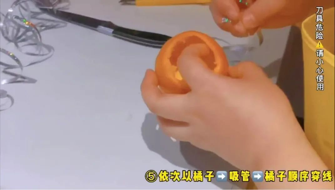 将绳子穿进桔子和吸管内,打结固定