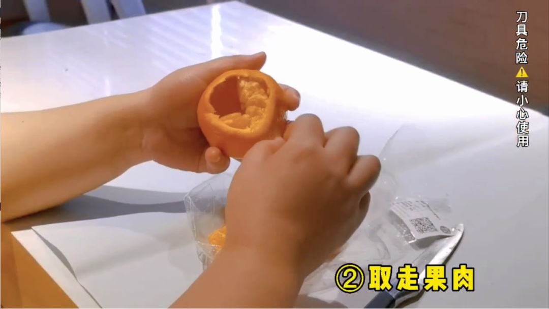 切掉桔子顶部的盖子,掏空桔子瓤