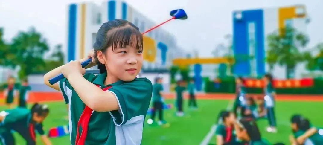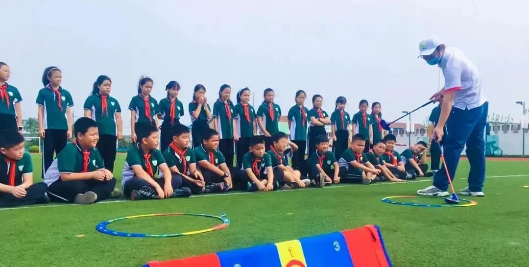 操场上,孩子们沐浴在阳光下,身着绿色校服,脚踩白色运动鞋,站在草坪上,模仿着老师握杆、挥杆的样子。