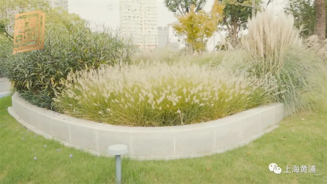 环顾花园,园内绿化景观的颜色层次非常丰富,除了秋天里绿中带一点黄的草坪,还有半人高的草,紫色成串的花朵,深红色贴近地面的小植物等等,前段时间风靡网络的粉红黛子草也是随处可见。这些绿化景观通过周围的台阶和石墙来呈现高低错落的层次感,构成一幅幅清新而浓烈的植物油画。