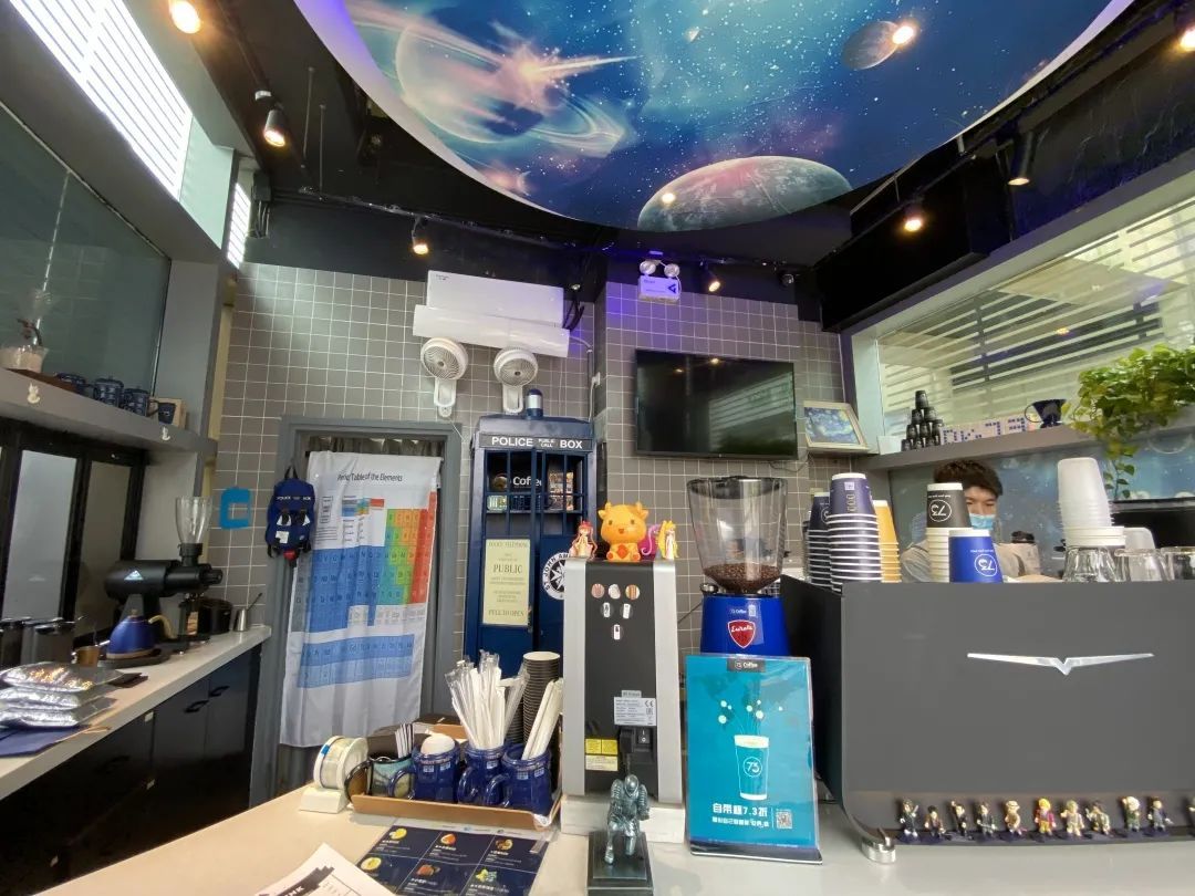 “理工男”店主林明旺,将《生活大爆炸》、《神秘博士》等影视元素融入到了装修风格和咖啡产品中。例如店内的“神秘博士咖啡”,是咖啡与茶共同制作的。“这款茶是南非的国宝茶,叫做‘路易波士’茶,不含咖啡因;咖啡则选用耶加雪啡的豆子,它本身带有花香。花香与茶香结合的效果特别好,制作成低咖啡因的创意饮品,很受大家的欢迎。”