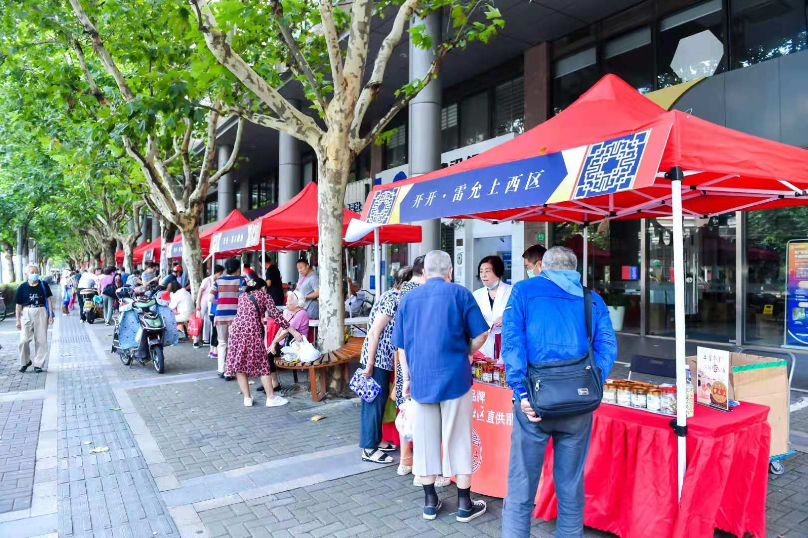 本届石门二路街道邻居节人气最旺之处无疑是早上就开市的便民集市。集市设立在新闸路945号沿街上,既有开开集团与九百集团旗下的雷允上、大美华、第六粮油、三阳盛、新长发、泰昌食品等老字号带来的名特优商品,也有静安区对口支援地区的新疆、云南等地的特色农产品,居民们纷纷结伴前来购买,许多热销商品没多久便已销售一空。