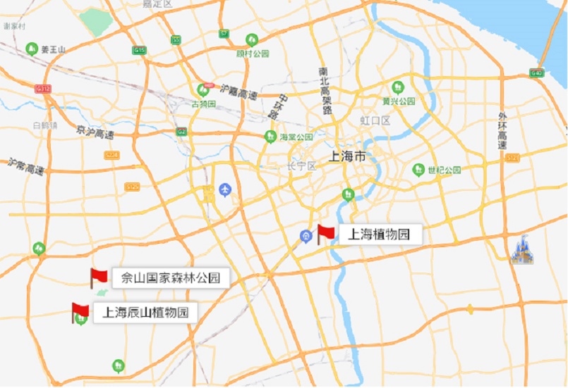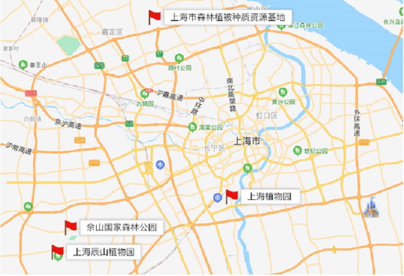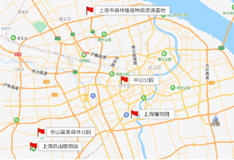上海植物园、上海辰山植物园、佘山国家森林公园、中山公园、上海市森林植被种质资源基地