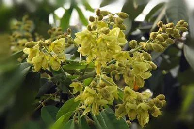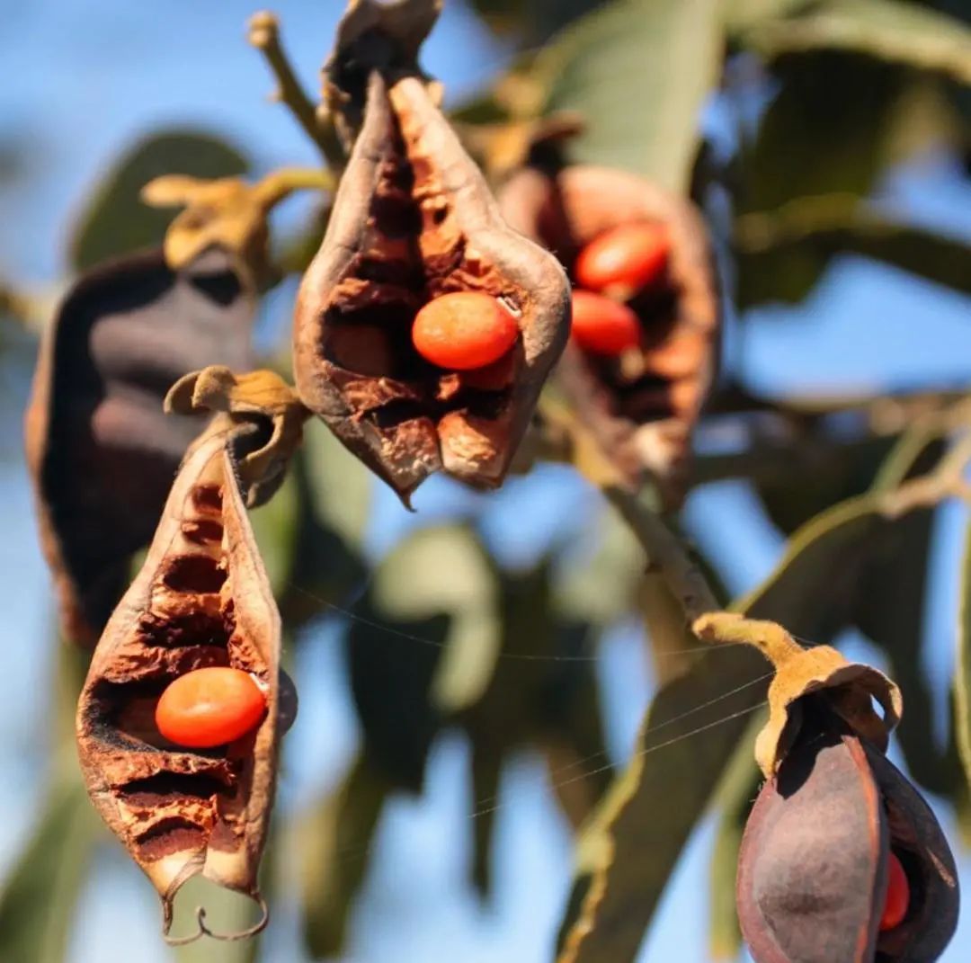 花榈木又名花梨木,豆科红豆属植物。花榈木,可以概括为“三绿”——枝绿、叶绿和花绿:枝干始终是青绿色,叶片为碧绿色,开出来的花也是少见的淡绿色。到了果实成熟的秋季,果荚会在树上裂开,露出一粒粒种皮鲜红的种子,十分亮丽!