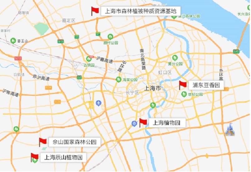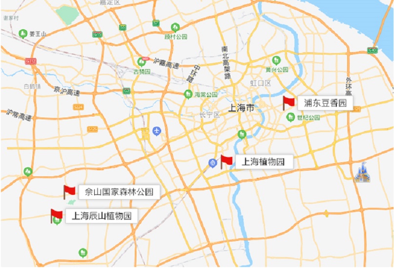 上海植物园、上海辰山植物园、佘山国家森林公园、浦东豆香园、上海市森林植被种质资源基地