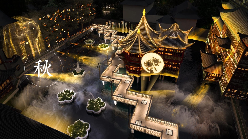 秋日的主题是“秋繁”,于是薄云如龙挂、潮涨如白虹、雨露落秋叶、秋叶染桂香的节令景观将会被光影艺术解构、提炼、重组。