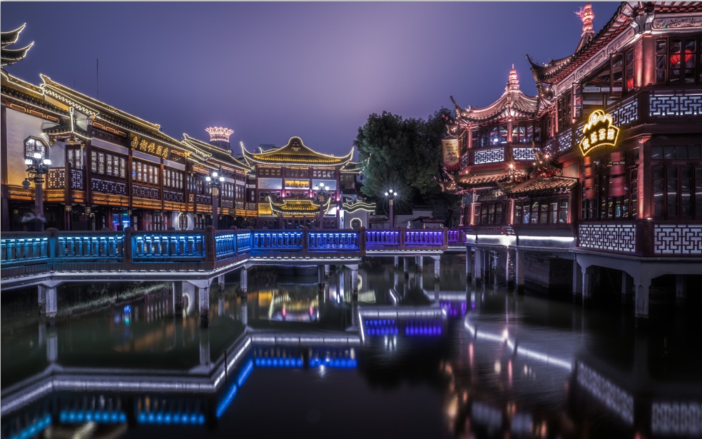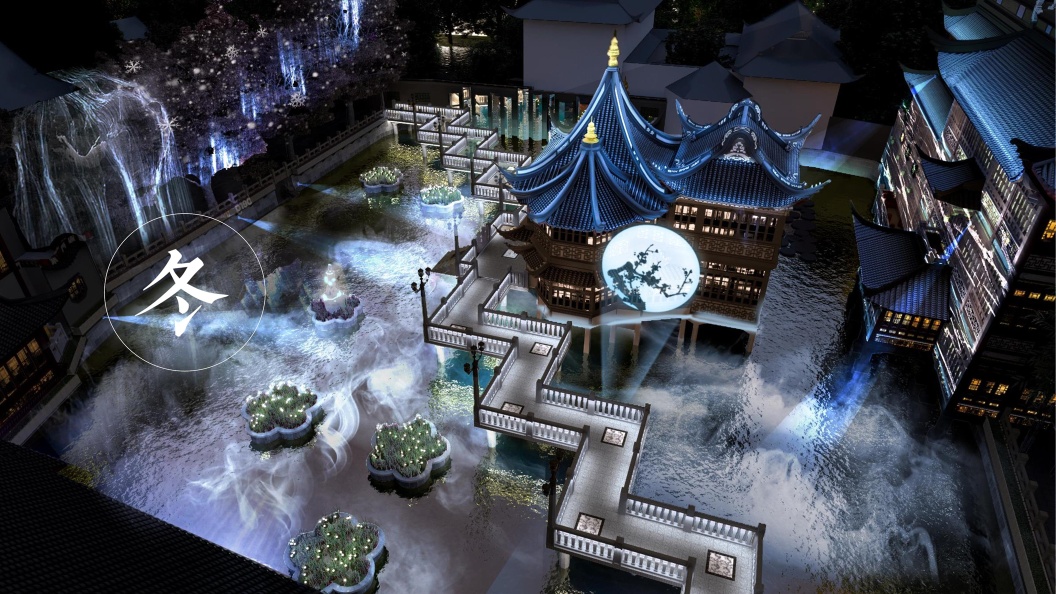 九曲焕彩光影秀是上海首个以节气为主题的光影秀,同时考虑到豫园独特的文化和地理形态,所以借鉴了传统的造园手法,利用九曲桥本身的动线,让光影在不同区域间转变,令观众在行走过程中,犹如乘坐飞虹观览世间变化。