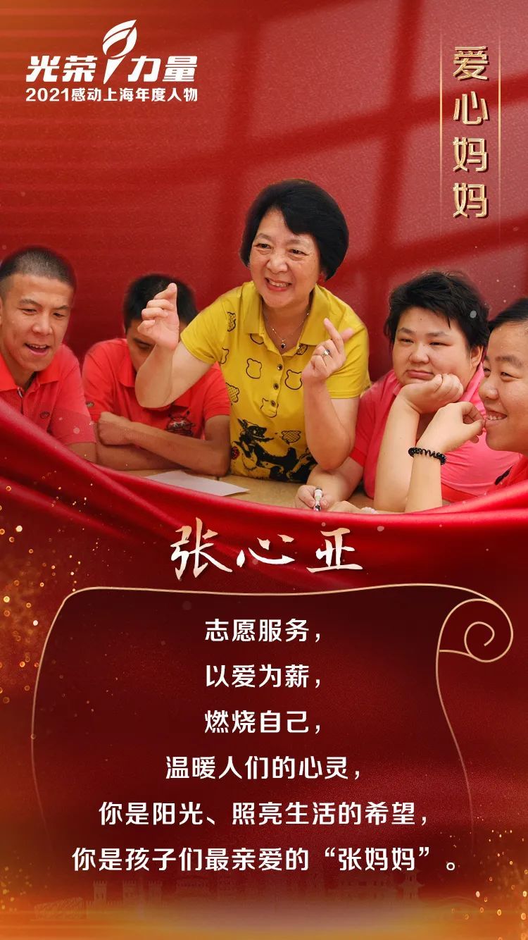 张心亚,女,汉族,1947年12月出生,中共党员,上海张心亚助残工作室理事长。2004年退休以来,一直致力于社区残疾人事业,2012年成立“张心亚助残工作室”,带领志愿者们以残障人士的需求为导向,先后服务41万人次、服务时长48万小时。即使在胃癌治疗期间,她仍不忘探望残障儿童,结束治疗后又继续投入到助残事业中。她像一缕阳光,为残疾人士带去无限温暖。曾获全国最美志愿者、上海市优秀共产党员、上海市杰出志愿者等。
