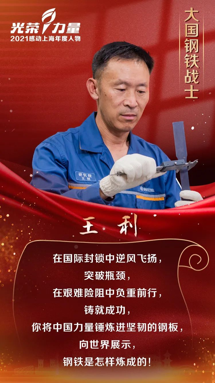 王利,男,汉族,1966年9月出生,中共党员,宝钢首席研究员,汽车用钢开发与应用技术国家重点实验室副主任。29年始终奋战在汽车用钢研发一线,他突破国外技术封锁,率先开发了第三代钢产品成套技术,成就了我国先进高强度钢从“跟跑到领跑”的历史跨越。他自主开发出一系列创新技术,获发明专利20余项,编制了10多个国家和行业汽车板标准。曾获全国优秀共产党员、国家科技进步一等奖、国家技术发明二等奖、中央企业劳动模范等。
