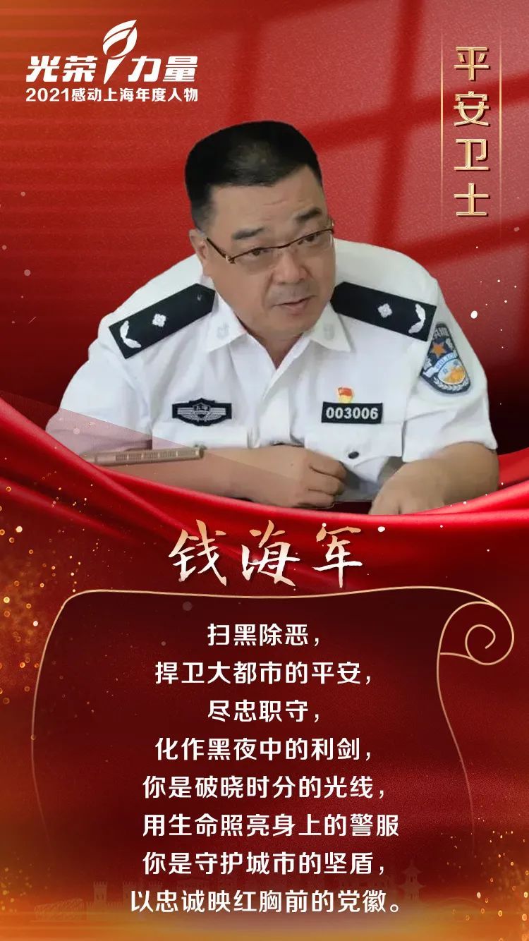 钱海军 ,男,汉族,1970年4月出生,中共党员,生前系上海市公安局刑侦总队党委委员、副总队长。从警28年,累计参与、指挥、指导侦破各类刑事案件3100余起,抓获3万余名犯罪嫌疑人,挽回群众经济损失超过26亿元。积极开创全民扫黑的管控新格局,形成了打击“套路贷”的“上海模式”。抗击疫情期间,牵头侦破涉疫案件140起。因劳累过度,牺牲在一线工作岗位上。曾获全国优秀共产党员、全国抗击新冠肺炎疫情先进个人、全国公安系统二级英雄模范等。