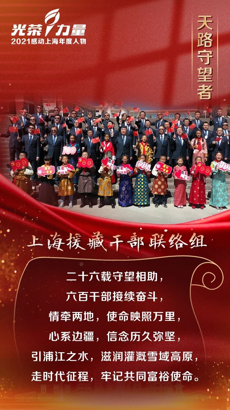 上海市援藏干部联络组。弘扬上海城市精神品格,发扬“老西藏精神”,克服高原艰苦条件,为西藏决战决胜脱贫攻坚作出积极贡献,对口支援日喀则五县(亚东、定日、江孜、萨迦、拉孜)全部实现脱贫摘帽。帮助群众改善生活条件,建设亚东边境小康示范村,扶持江孜青稞、亚东鲑鱼等特色产业,助力固边守边和兴边富民。发挥“组团式”医疗和教育援藏优势,打造“带不走”的人才队伍。曾获全国脱贫攻坚先进集体、上海市五一劳动奖状等。