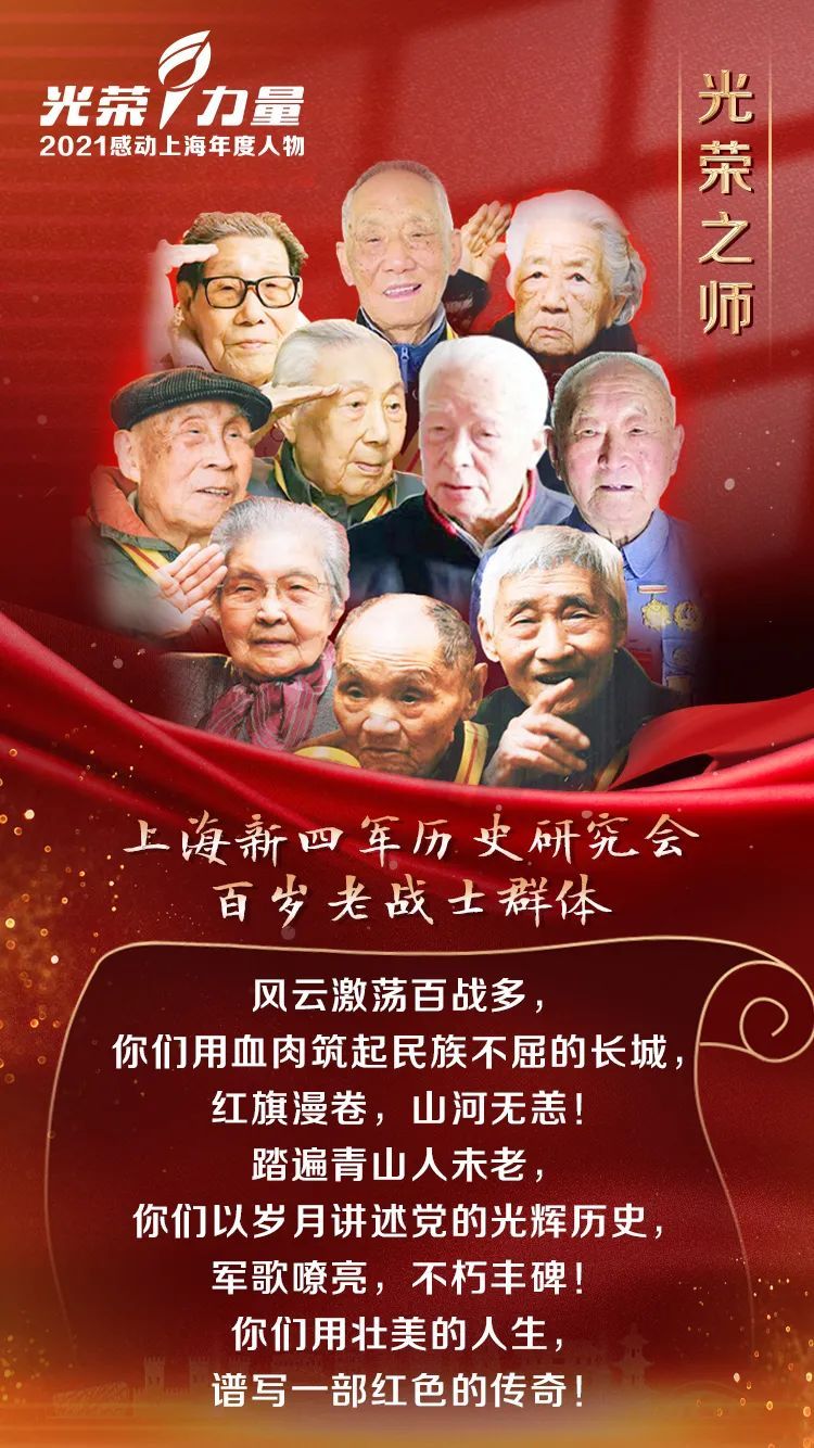 上海市新四军历史研究会百岁老战士群体。由46位百岁新四军老战士组成,平均年龄102岁,平均参加革命时间80年,平均党龄79年。他们年轻时代投身革命,历经了抗日战争、解放战争、抗美援朝战争血与火的洗礼,为民族独立和人民解放立下卓越功勋。和平年代,他们为社会主义革命建设和改革开放,为国家安宁、人民幸福奋发拼搏。进入新时代,他们继续发光发热,讲述红色故事、传播革命精神,为深入开展党史学习教育树立榜样。