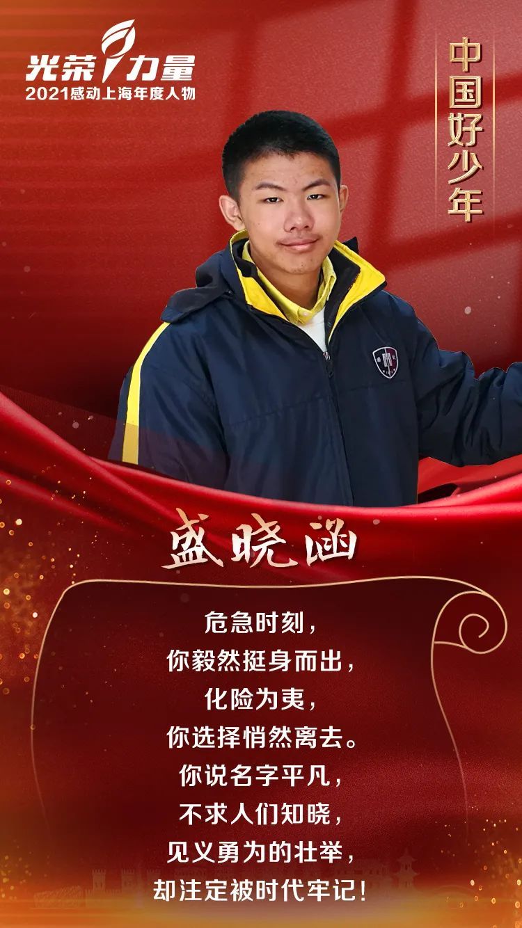 盛晓涵,男,汉族,2005年2月出生,上海市格致中学学生。他用“教科书式”的心肺复苏,为一位突发心梗倒在路边的老人争取了宝贵的抢救时间,直至救护车到来才悄悄离去。他模范践行“雷锋精神”,做好事不留名,受到社会各界广泛赞誉。他热心社会公益,将见义勇为奖金全额捐给了家境贫困的心脏病患儿,组建了“黄浦区红十字BOYS”,积极开展志愿服务和文明实践活动。曾获上海市见义勇为先进个人,上海市新时代好少年等。