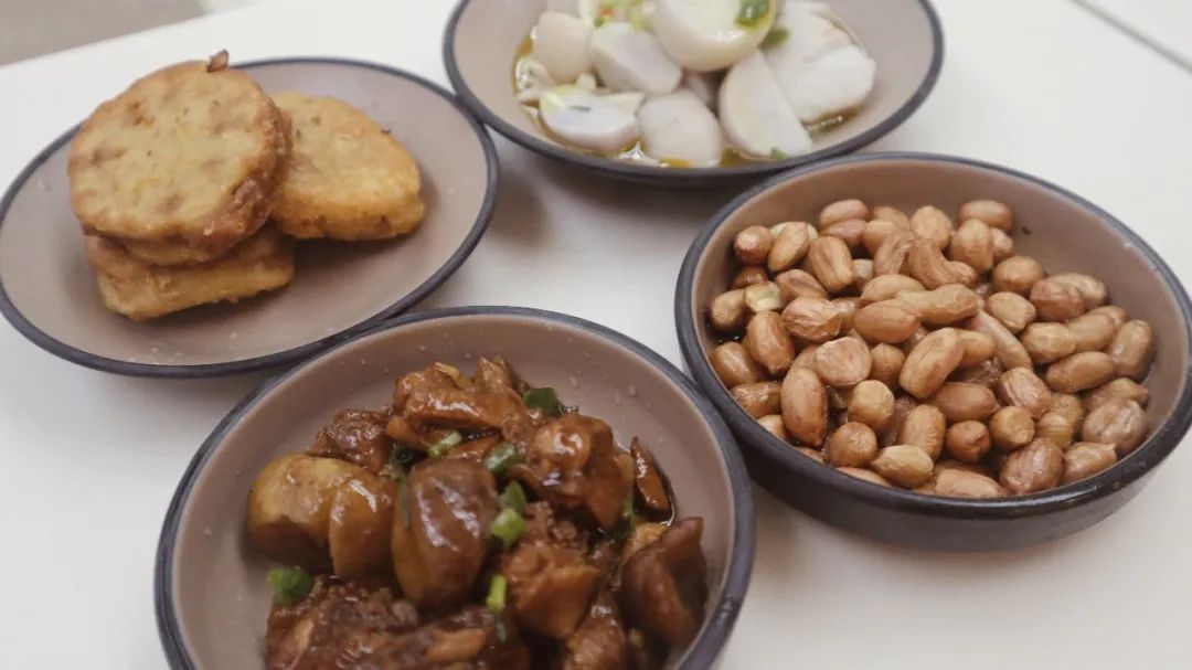 板栗烧鸡+香酥藕盒+葱油芋艿+水煮花生+桂花糕