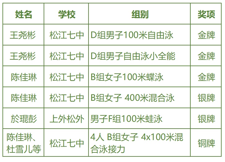 比赛中,松江健儿奋勇争先,顽强拼搏,比赛成绩非常喜人。松江七中六年级学生(原就读三实小)王尧彬成功拿下2枚金牌,100米自由泳打破了11岁年龄组全国纪录,可喜可贺!未来可期!