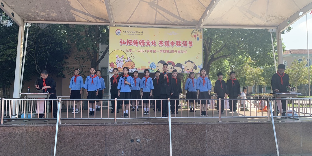 为了让队员们了解中秋节的由来及风俗习惯,感受中秋节的传统文化,体验节日的快乐,九亭第二小学举行“弘扬传统文化 共话中秋佳节”主题升旗仪式。队员代表为大家介绍了中秋节的传统习俗,并深情朗诵《春江花月夜》,在有说、有唱、有写、有动的表演中,全校师生感受到了传统文化的魅力和浓浓的节日氛围。
